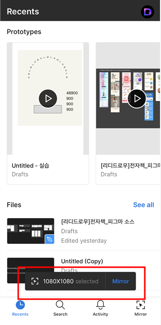 PC에서 프레임을 선택하고 앱을 열면 위와 같은 스낵바가 올라옵니다. Mirror이라고 옆에 써있는게 보이시죠? 클릭하시면 작업하고 있는 화면을 보실 수 있습니다.